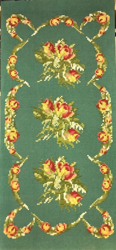 Veggteppi, útsaumað (góbelin) í grænan ullarjafa, hæð 99 cm, breidd 46,5 cm. Blómaskreyting (rósir). Verk Sigurbjargar Pálsdóttur. Gefendur Páll Ævar Pálsson tannlæknir í Kópavogi, Stefán Pálsson og ( Bergþóra) Karen Pálsdóttir nú búsett á Spáni. Úr búi Páls Sigurðssonar bónda í Skammadal í Mýrdal og Bergþóru Sveinsdóttur konu hans. Kom frá dánarbúi móðurbróður þeirra systkina, Sveins Pálssonar í Blönduhlíð 7, Reykjavík, sem dó 2003. Einnig úr búi Ársæls Sigurðssonar skólastjóra og Sigurbjargar Pálsdóttur, Blönduhlíð 7.