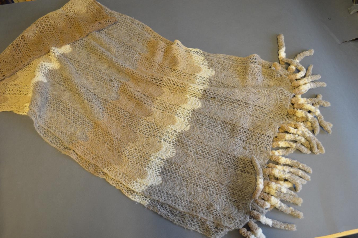Herðasjal í sauðarlitum, heklað. Er með kögri. Verk Helgu Jónsdóttur frá Skammadal, f. 1854. Úr dánarbúi Sigurbjargar Pálsdóttur í Blönduhlíð 7, Reykjavík