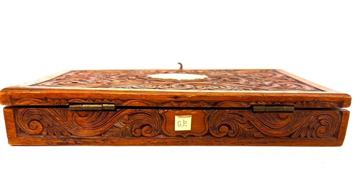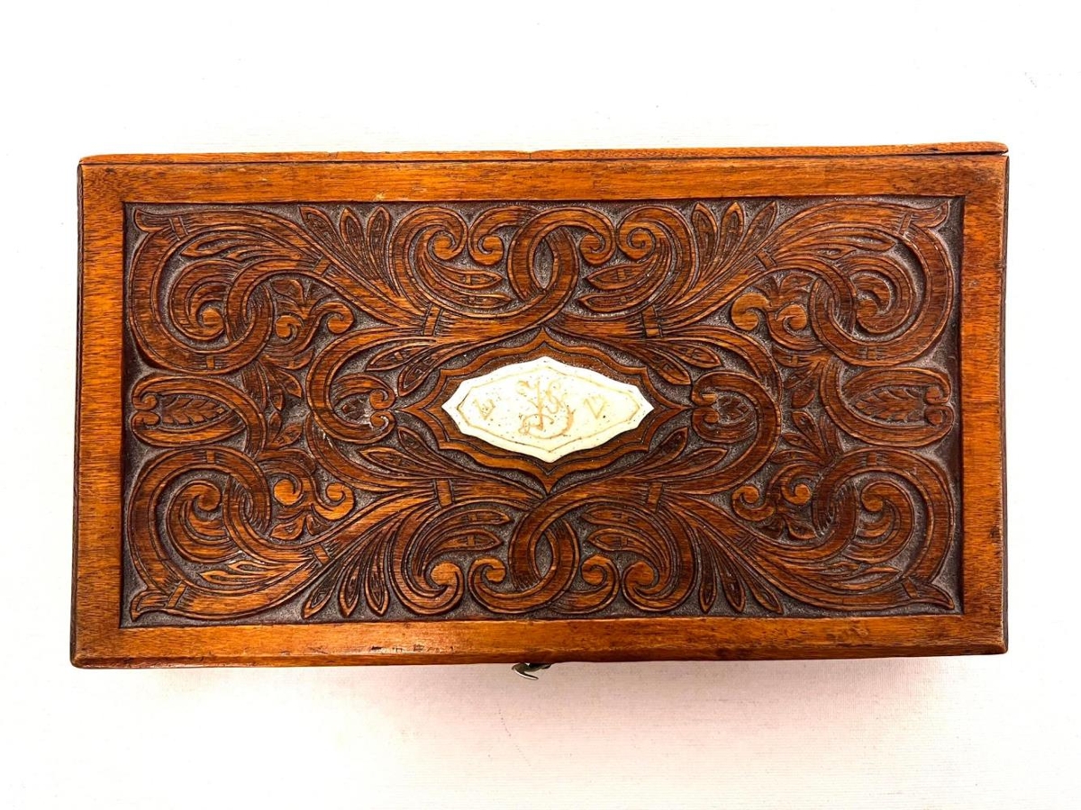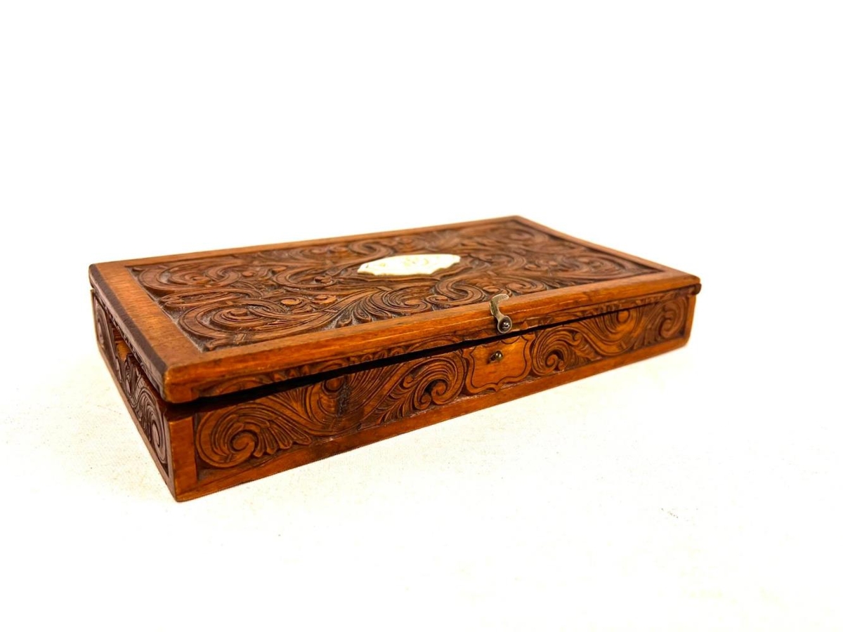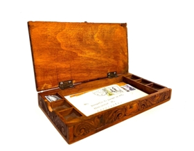 Útskorin bréfa askja/kistill. Eitt stórt hólf í miðju en til hliðar eru lítil hólf sem passa gömlu frímerkjunum litlu. Merkt G.Þ.