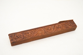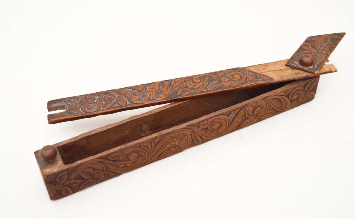 Prjónastokkur Ingigerðar Árnadóttur frá Stóra-Hofi, útskorinn. Ber svip af verkum Filippusar Bjarnasonar frá Sandhólaferju. Á lokinu er fangamark Ingigerðar.