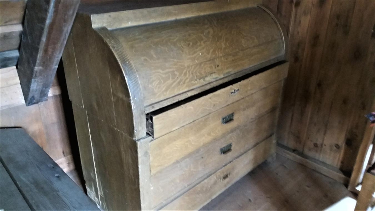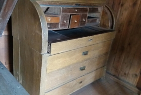 Skatthol með renniloki (hallloki), málað ljósri eikarmálningu. Er með þremur skúffum. Tvísett skúffuröð undir hallloki. Kynni áður að hafa verið með skápi að ofan. Er innflutt (danskt). Ágúst á Hofi sagði að sú sögn hefði fylgt skattholinu að það hefði fyrst verið í eigu Hannesar Finnssonar biskups, en sérfróðir menn geta þá ákvarðað aldur þess. Guðmundur Þorbjarnarson mun hafa komið með það að Hvoli utan úr Vestmannaeyjum.