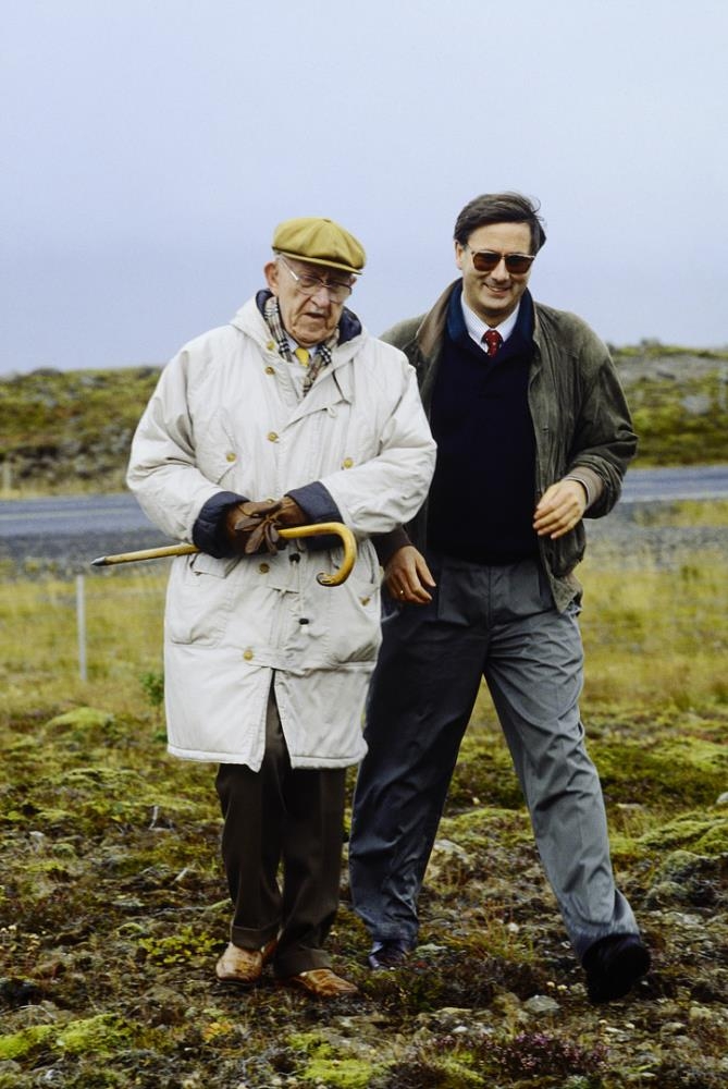 Halldór á efri árum, tekur á móti Magnúsi Magnúsmannai sjónvarpsmanni, útgefandinn hans Ólafur Ragnarsson var viðstaddur.