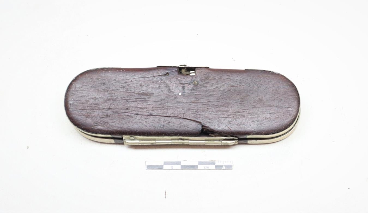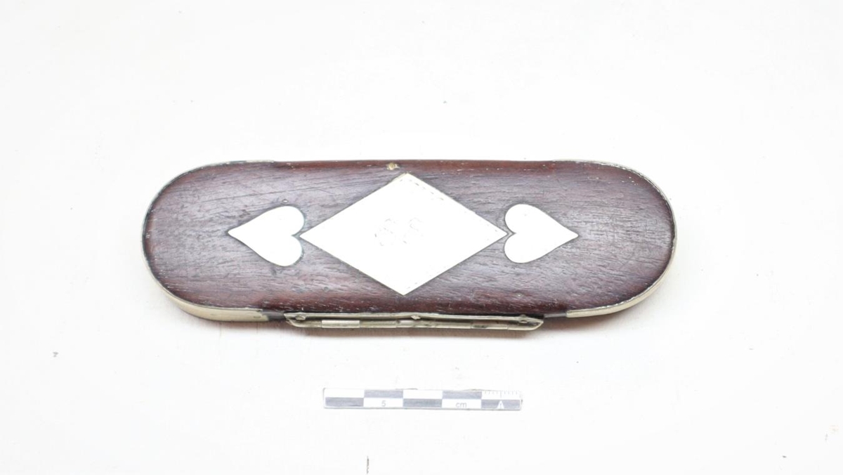 Gleraugnahús, úr mahóní með nýsilfurskrauti, hjörtum og tígli, læsingu og nýsilfri á endum. Grafið er fangamarkið SS. sem er óþekkt. Úr eigu Daða Davíðssonar og notaði hann húsið. Stærð= 13.8 cm x 4.8 cm x 1.5 cm.