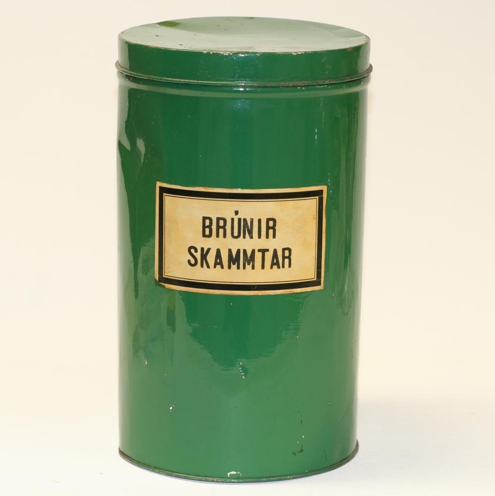 Dunkur, dós, grænmálaður úr járni (málmi). Í dunknum eru 17 litlar pappaöskjur með 10 skömmtum hver.