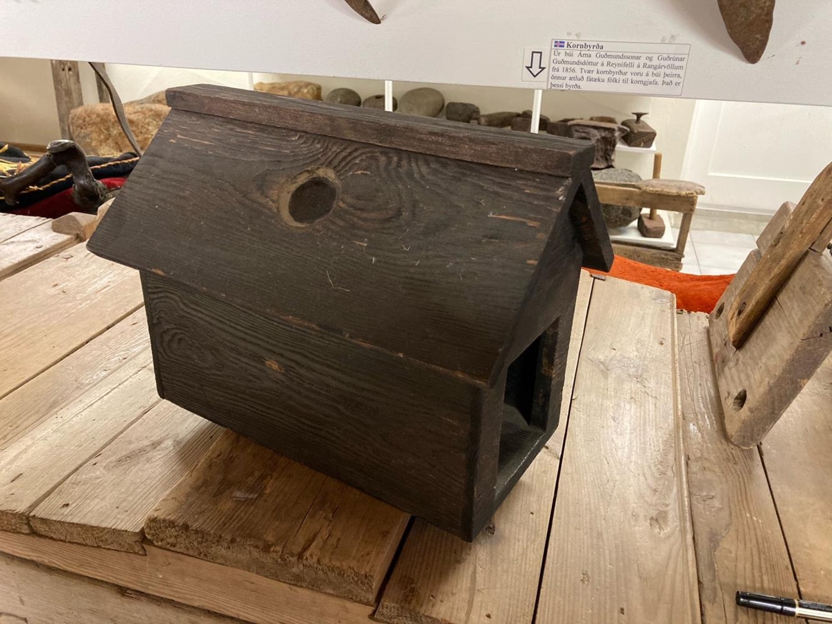 hringglugga á þaki og op á öðrum gafli. Í biðunni var borið kola með ljósi milli bæjar og fjóss eða milli húsa yfirleitt, er til þurfti að taka. Biðan er smíðuð af Magnúsi Ingólfssyni trésmið í Vík eftir líkani og fyrirsögn Guðjóns í Hlíð. Gefið af Guðjóni guðjónssyni í Hlíð í Skaftártungu.