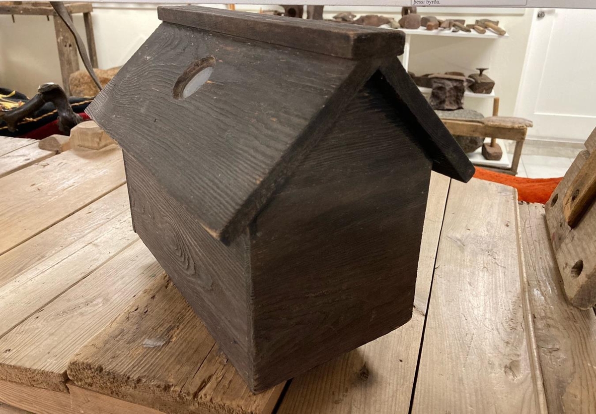 Biða, eftirlíking af ljósbera, sem til var í Hlíð í æsku Guðjóns. Þetta er húslaga tréstokkur, með tvo
