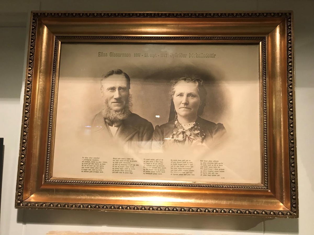 Stækkuð, innrömmuð ljósmynd af Elíasi Gissurarsyni á Syðri-Steinsmýri (1843-1920) og konu hans Gyðríði Þórhalladóttur (f.1848) Á myndina er prentað ljóð til þeirra hjóna ort af Guðmundi Magnússyni (Jóni Trausta). Þetta er frá 50 ára brúðkaupsafmæli. Gefið af Gissuri Elíassyni, Laufásvegi 18 í Reykjavík og fjölskyldu hans.