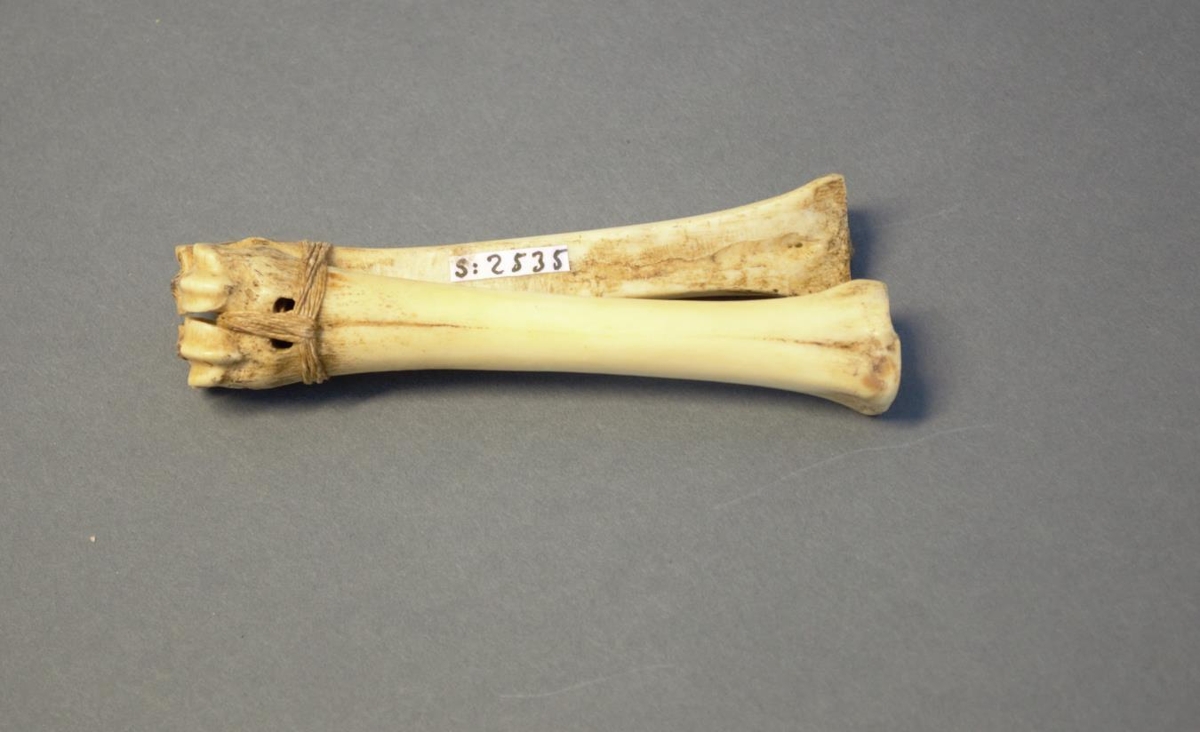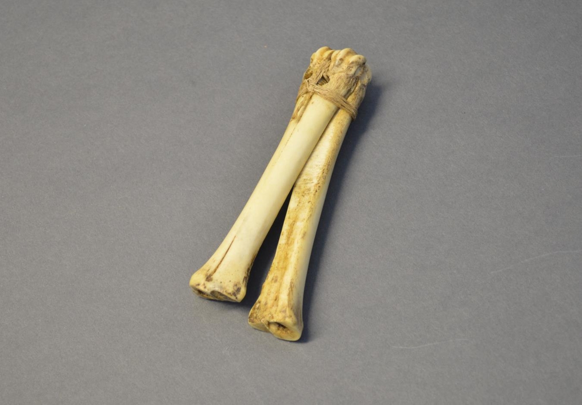 Leggjatangir úr framfótaleggjum lambs og högginn innan á þá flötur. Vel varðveittar. Gefandi Kristín Friðriksdóttir frá Norður-Hvoli í Mýrdal.