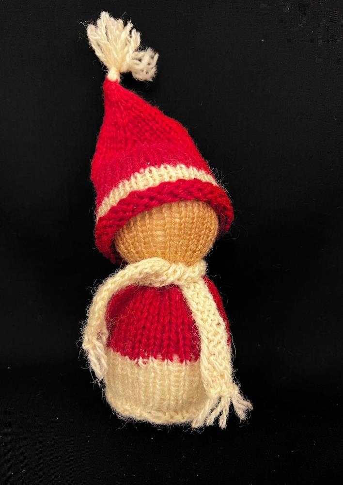Jólaföndur - heimagert skraut. Frauðkúlur festar saman og prjónað utan um þær svo úr verður skraut dúkka með trefil og skotthúfu. Hvít og rauðleit.