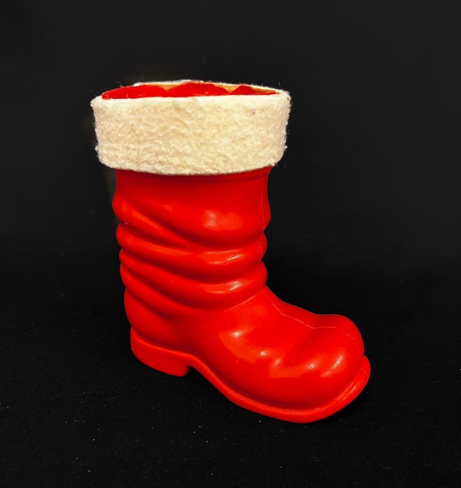 Lítið rautt plast stígvél með hvítum bryddingum. Eins og jólasveinastígvél. Gæti hafa verið undan sælgæti upphaflega en svona stígvél voru líka oft sett út í glugga fyrir gjafirnar frá jólasveinunum.
