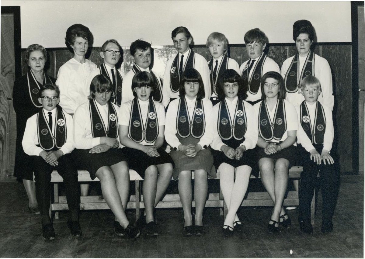 Unglingar í Barnastúkunni Siðsemd nr. 14 í Garði með einkenni sín. Sitjandi frá vinstri: Magnús Torfason frá Miðhúsum, Ingibjörg Þórðardóttir frá Fagrahvammi, Þóra Sigríður Njálsdóttir frá Bergþórshvoli, Guðveig Sigurðardóttir frá Brautarholti, Elísabet Guðný Einarsdóttir frá Silfurtúni, Svandís Torfadóttir frá Miðhúsum, og Þórir Guðmundsson frá Lindartúni. Standandi frá vinstri: Auður Tryggvadóttir frá Gerðum, Steinunn Sigurðardóttir frá Brekku, Magnús Guðmundsson frá Réttarholti, Helgi Bjarnason frá Vík, Jón Hjálmarsson frá Nýjalandi, Jón Guðmundsson frá Völlum, Ásmundur Björnsson frá Sunnuhvoli og Sigrún Oddsdóttir frá Nýjalandi. Auður sá um tónlistina á stúkufundunum og Steinunn og Sigrún voru gæslumenn barnastúkunnar. Myndin er tekin í Samkomuhúsinu í Garði í tilefni 75 ára afmælis barnastúkunnar árið 1966, stúkan var stofnuð 4. des. árið 1891.