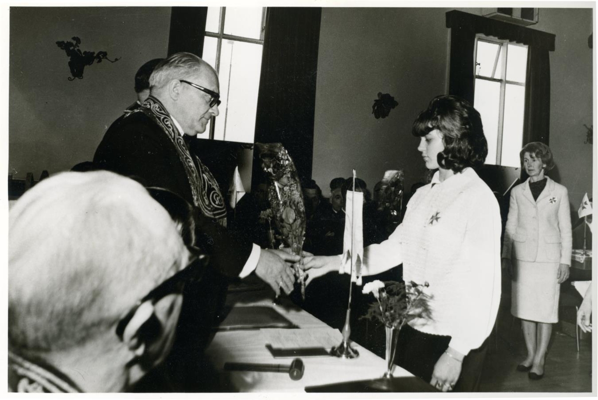 Elísabet Guðný Einarsdóttir frá Silfurtúni í Garði á þingi Stórstúku Íslands sem fagnaði 80 ára afmæli sínu (1886 – 23. júní 1966). Elísabet var í Barnastúkunni Siðsemd nr. 14 í Garði á þessum tíma. Hér færir Elísabet Ólafi Þ. Kristjánssyni stórtemplar I.O.G.T blómvönd, líklega frá Barnastúkunni Siðsemd. Steinunn Sigurðardóttir frá Brekku í Garði, annar gæslumaður Siðsemdar sést að baki Elísabetar.