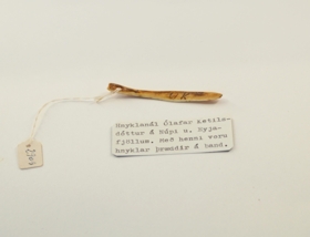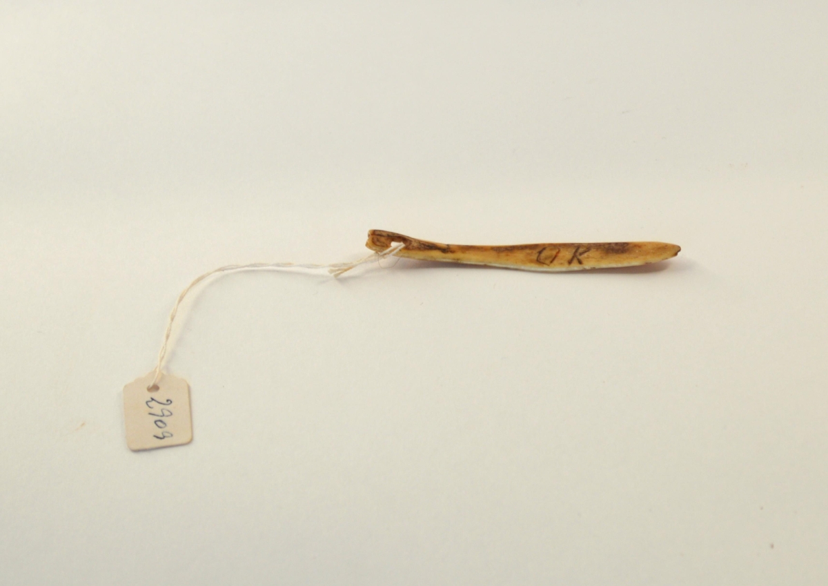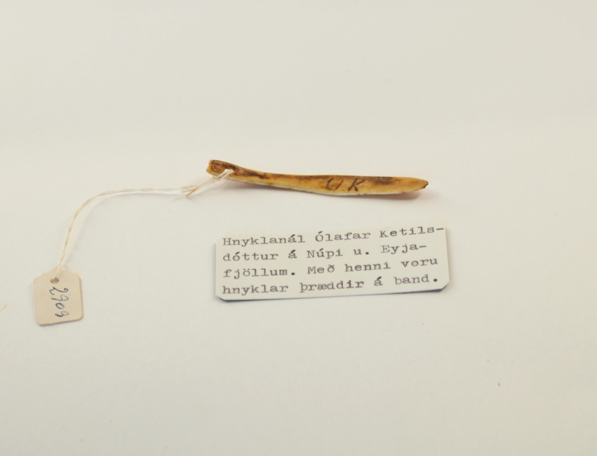 Hnyklanál fóstru gefanda, Ólafar Ketilsdóttur á Núpi u.Eyjafjöllum, smíðuð úr beini. Fangamark Ó.K. áletrað.