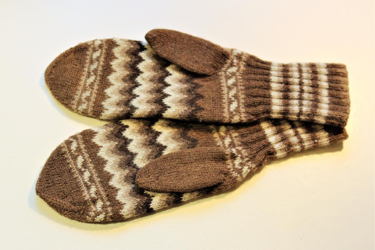Útprjónaðir kvenmannsvettlingar í sauðarlitum, fínt ullarþelband. Eru í fjórum brúnum tónum og hvítu. Verk Ingilaugar Teitsdóttur í Tungu í Fljótshlíð er hún var 86 ára.