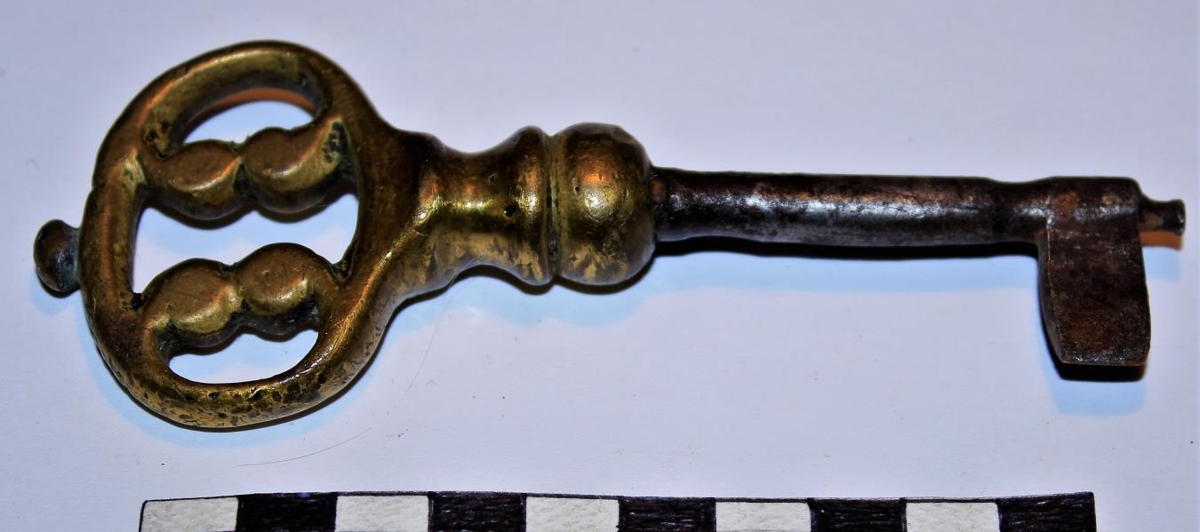 Lykill sem lengi var í skemmuhurð á Hörgslandi í tíð Ólafs umboðsmanns Pálssonar og víðar, skegg og pípa úr járni, en halda úr kopar.