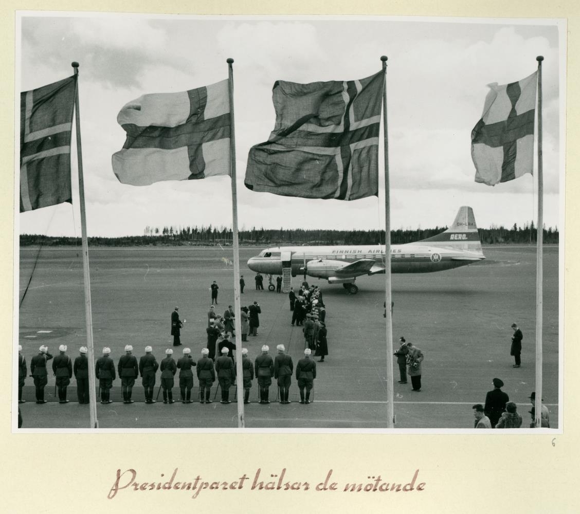 Móttökuathöfnin á flugvellinum, forsetahjónin heilsa móttökuhópnum. Flugvélin bakvið er merkt FINNISH AIRWAYS á búknum og á stéli OH-LRA og AERO.