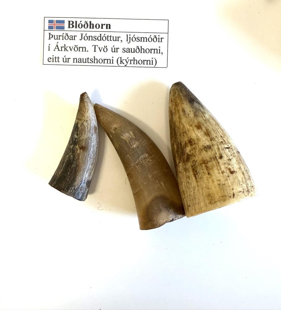 Blóðhorn, tvö, úr eigu sömu kvenna ( Þórunnar í Árkvörn og Guðbjargar dóttur hennar ). Bæði úr sauðarhornum.