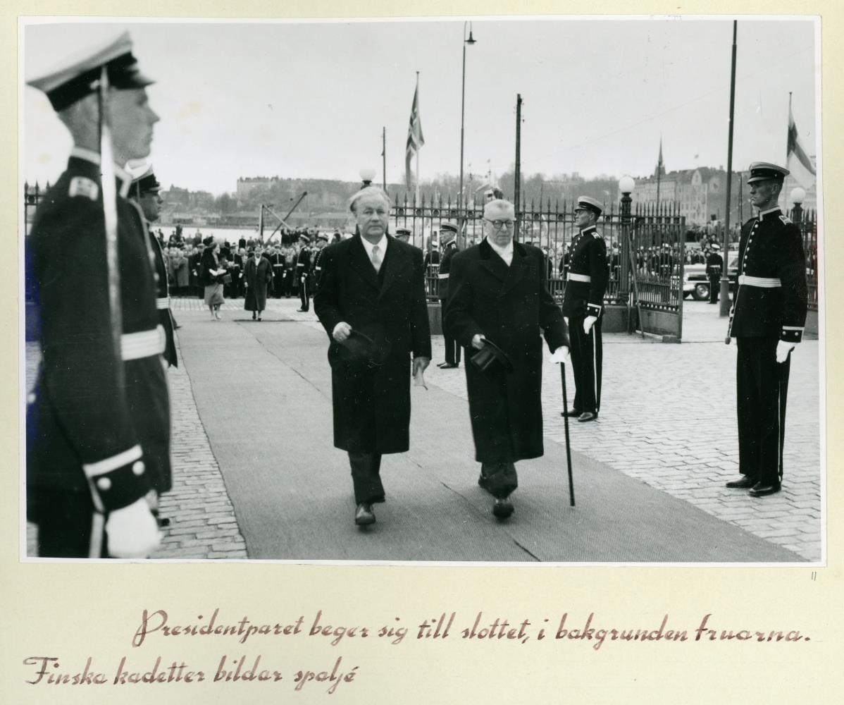 Skýringar á sænsku við flestallar myndirnar.: Presidentparet beger sig till slottet, i bakgrunnen fruarna. Finska kadetter bildar spaljé.