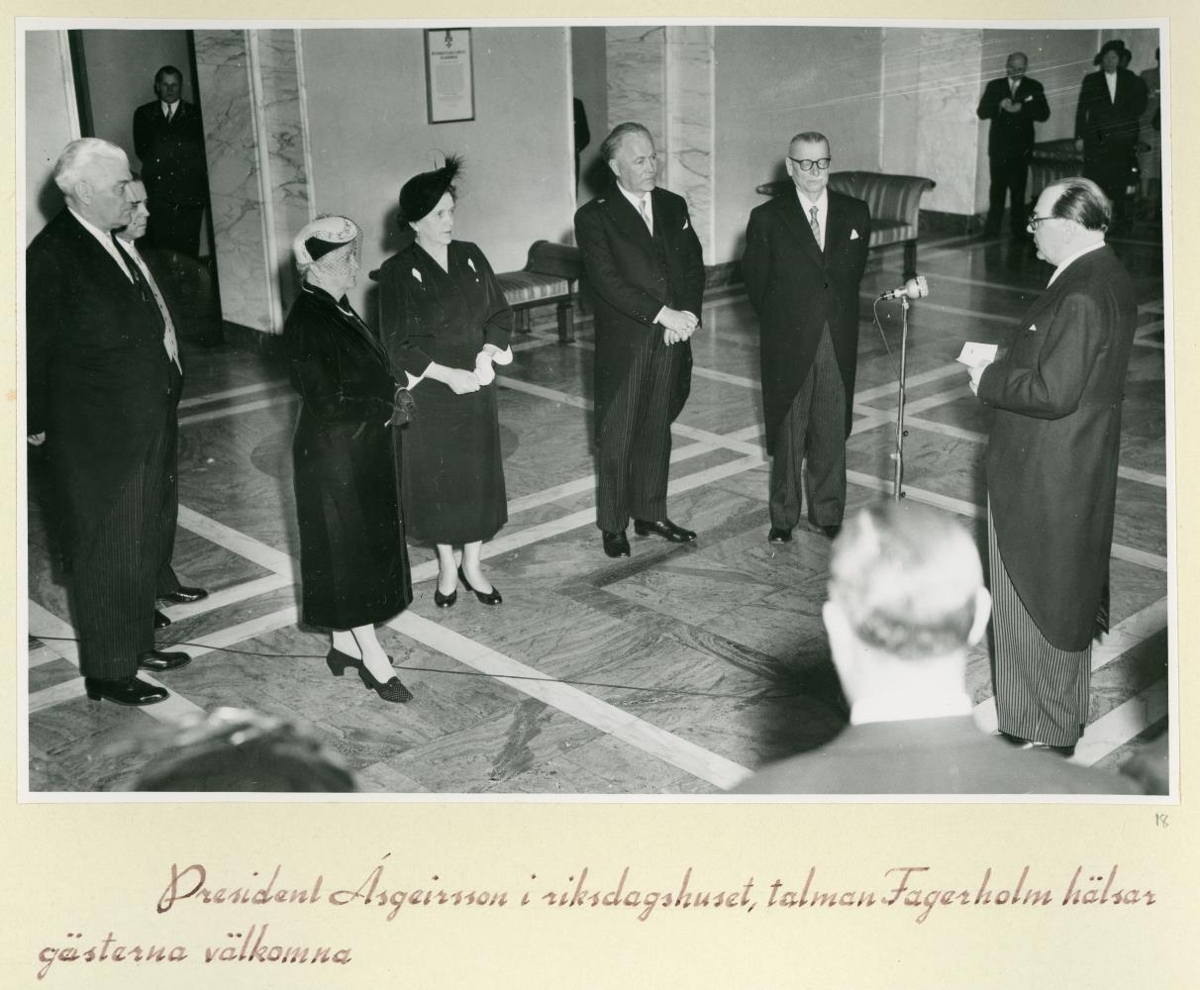 Skýringar á sænsku við flestallar myndirnar.: President Ásgeirsson i riksdagshuset, talman Fagerholm hälsar gästerna välkomna.
