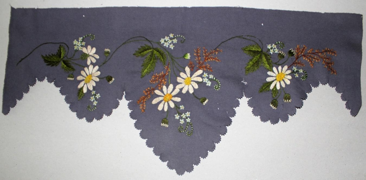 Útsaumað hilluhengi, sennilega verk Guðlaugar Halldórsdóttur frá um 1915. Hefur ekki verið sett upp. Gott verk. Blómaskreyting. Úr búi Halldórs Jónssonar í Suður-Vík.