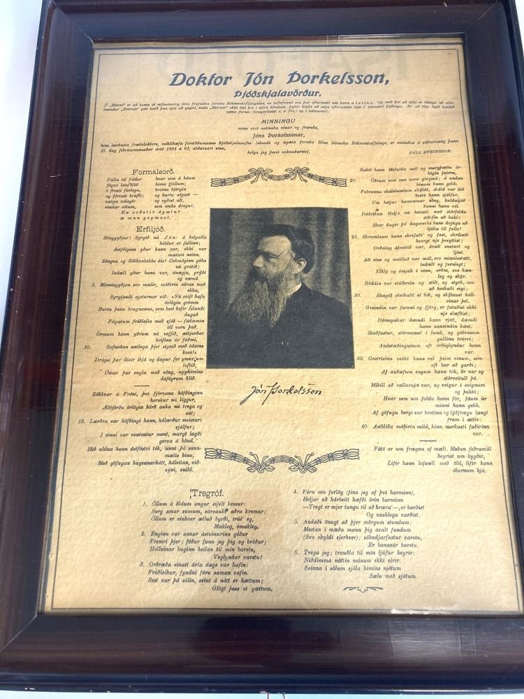 Innrömmuð ein blaðsíða úr Morgunblaðinu. Minning dr. Jóns Þorkelssonar er dó 10. febrúar 1924. Var áður í stofunni í Suður-Vík í Mýrdal. Gefandi Matthildur Ó. Valfells.