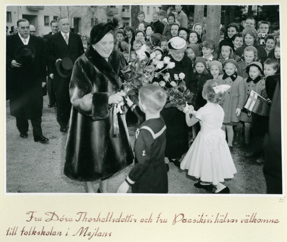 Frú Dóra Þórhallsdóttir og frú Paasikivi taka við blómum við komuna til barnaskóla Mejlans-hverfisins í Helsinki.