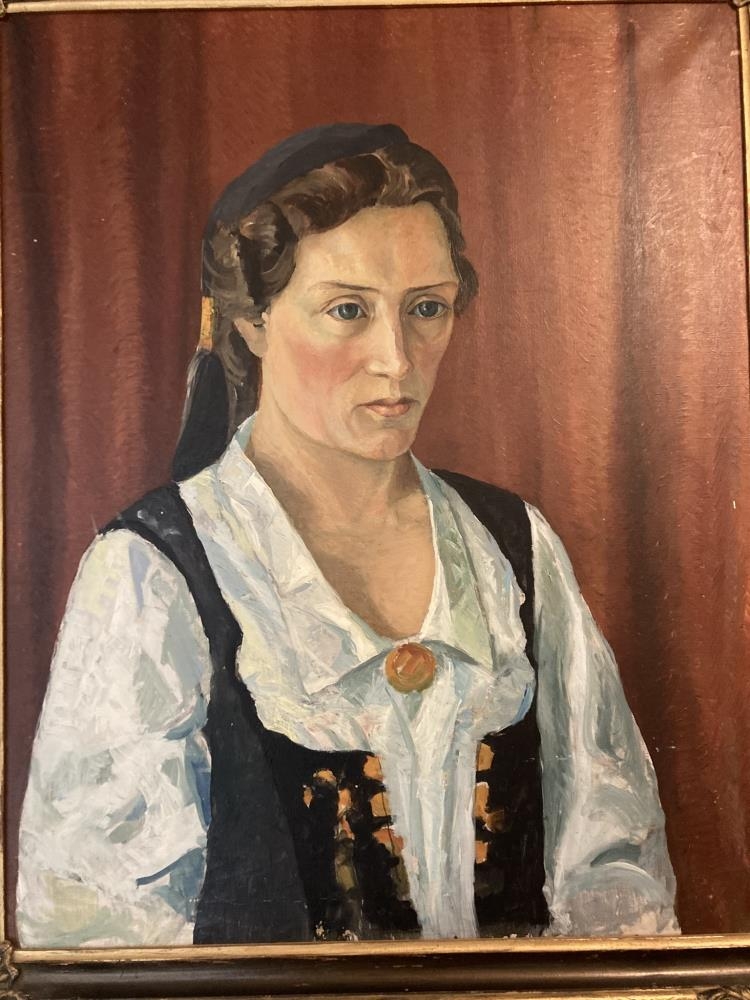 Stórt, innrammað olíumálverk af Láru Eyjólfsdóttur í Múlakoti, klæddri upphlut. 78 x 64 cm..