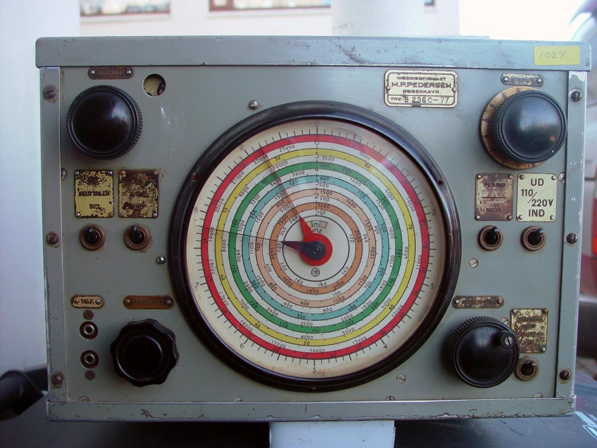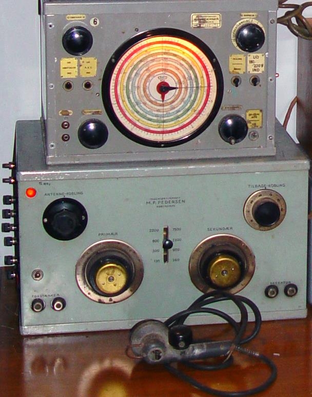 Talstöð/Viðtæki. Tegund: MP Pedersen Gerð:20 Watta AM talstöð. Framleiðsluland: Danmörk, tíðnisvið: sendis, 1,5 – 5 mHz Bátabylgja. Viðtækið Langbylgju 150 kHz til 2,3 mHz. Stærð viðtækis: B 35 X H 25 X D25 sm. Stærð sendis: B 44 X H 26 X D31 sm. Efni: Ál undirstaða ásamt kassa og grá græn framhlið. Gefandi: Sigurður Harðarson rafeindavirki.
