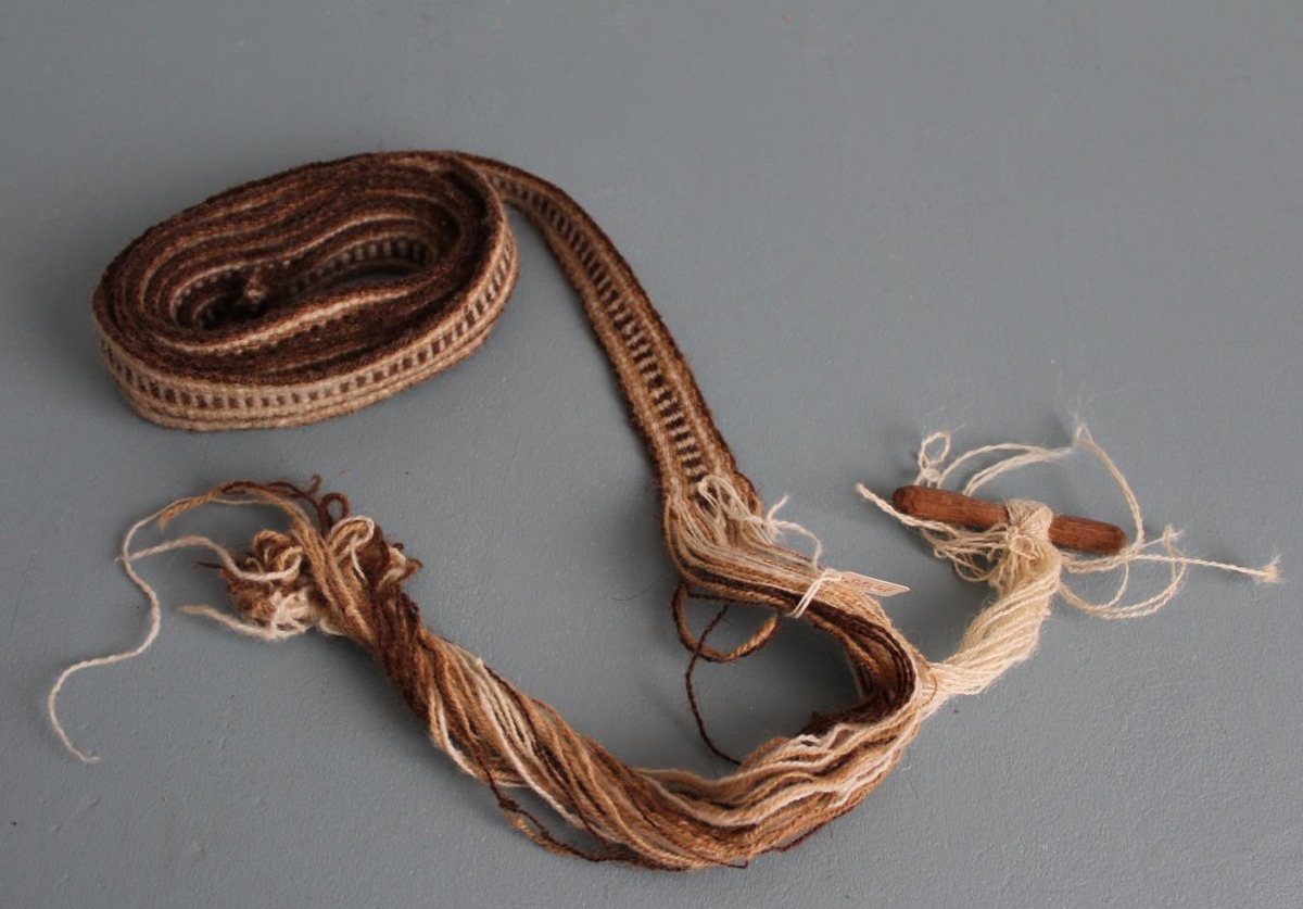 Sokkabandalindi, fótofinn. Höföld fylgja. Vantar smáspýtu sem fyrirvaf var undið á. Verk Guðnýjar Jónsdóttur í Hlíð. Gefið af Signýju Sveinsdóttur frá Þykkvabæjarklaustri.