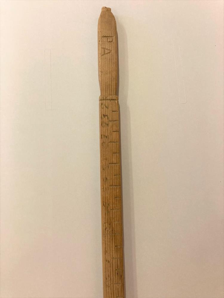 Trékvarði úr eigu Páls Auðunssonar í Nikulásarhúsum í Fljótshlíð. Fangamark hans: P.A. grafið á handfangið. Alinmálið er 63 cm.