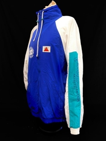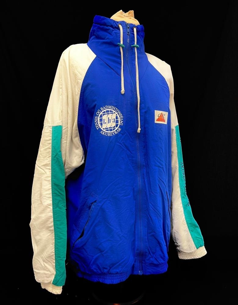 Jakki með rennilás. Blár með hvítum og grænum ermum. Á brjósti er merki og áletrun : Tennis- og badmintonfélag Akureyrar. Á ermi stendur : Búnaðarbanki Íslands Akureyri