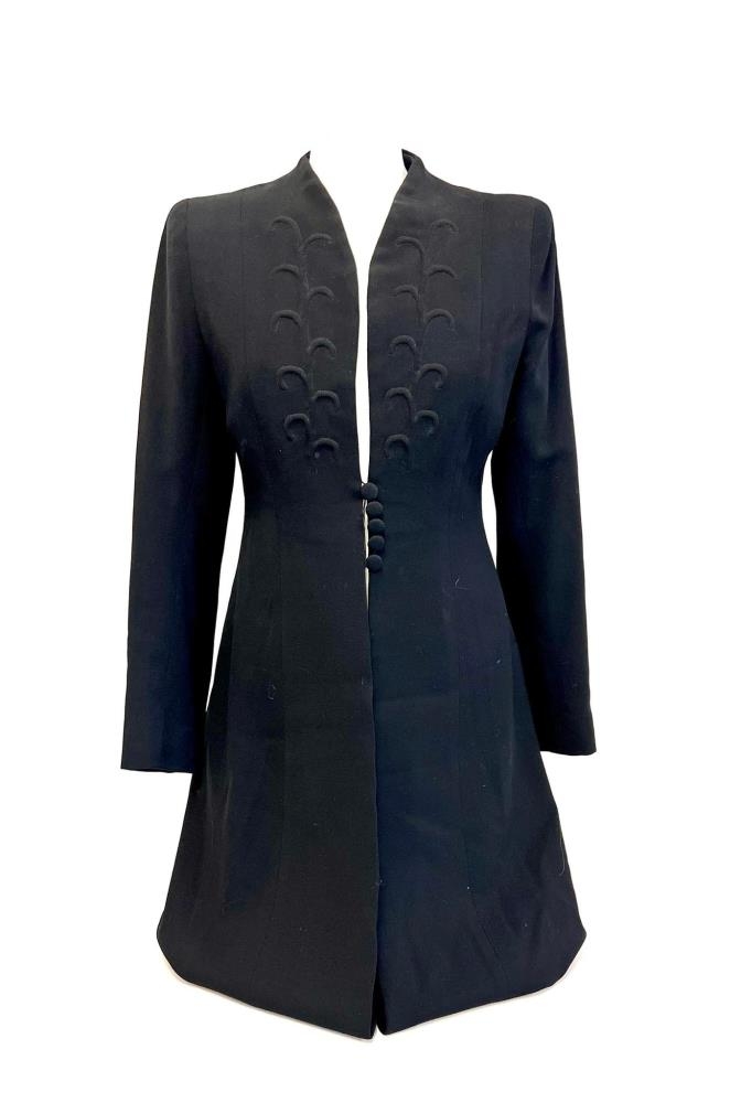 Svört flík, eins og sparikápa en þröng svo gæti líka verið kjóll. Hnepptur saman með litlum hnöppum sem raðast þétt saman. Útsaumað mynstur yfir brjóststykkjum. Ófaldaður að neðan.