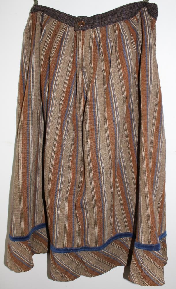 Millipils, röndótt, ofið í litum, tvistvefnaður. Ofið og saumað af Önnu Þórðardóttur í Grímsnesi, sem nefnd var Anna saumakona. Pilsið er úr eigu Sigurleifar Þorleifsdóttur (1858-1946) húsfreyju á Svínavatni. ömmu Skúla. Anna Þórðardóttir drukknaði í Hólaá í Laugardal 1918.