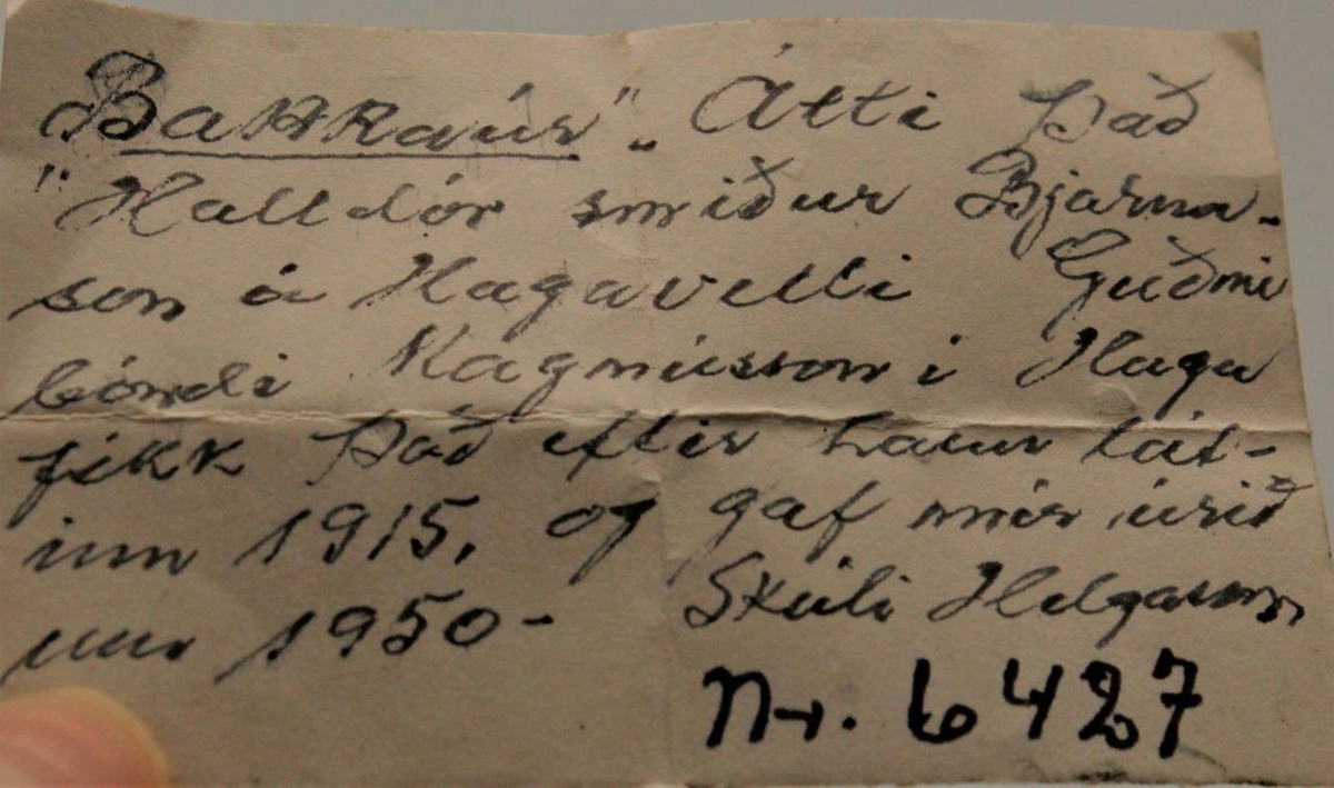 Bakkaúr. Var í eigu Guðna Magnússonar bónda í Haga (1882-1962). Miði með rithönd Skúla fylgir:"Bakkaúr. Átti það Halldór smiður Bjarnason á Hagavelli. Guðni bóndi Magnússon í Haga fékk það eftir hann látinn 1915 og gaf mér úrið um 1950." Gler á skífu er brotið. Hlutir afhentir 16. apríl árið 2002 af Skúla Helgasyni fræðimanni frá Svínavatni í Grímsnesi (d. 2002). Hann vildi að ekkert af einkamunum hans færi til Byggðasafns Árnesinga og Jón Jónsson á Svínavatni, afi hans var Rangæingur.