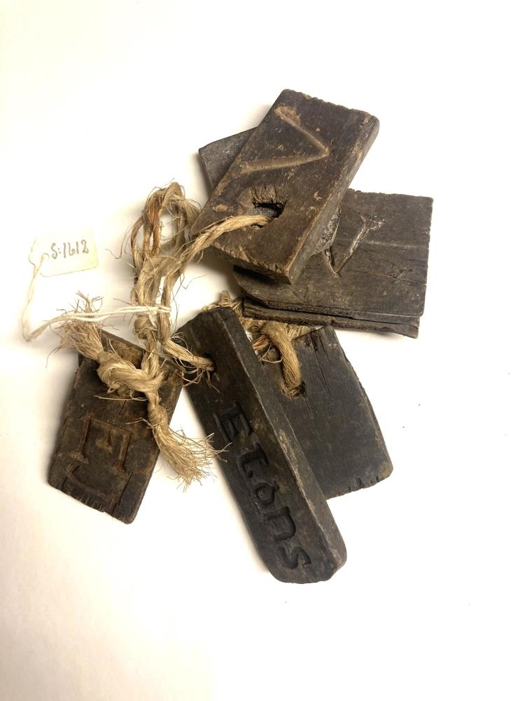 Kippa af merkispjöldum, merkt Eiríki og Vilhelmínu Böðvarsdóttur bústýru hans. Gefið af Sigurði Hjálmarssyni í Vík í Mýrdal, hlutir úr búi Eiríks Jónssonar í Vík: