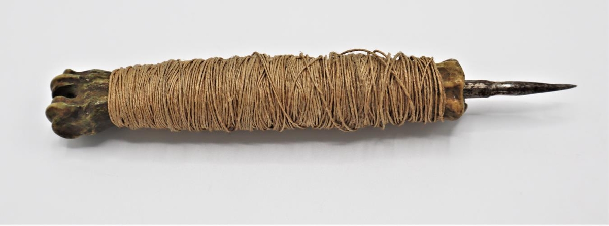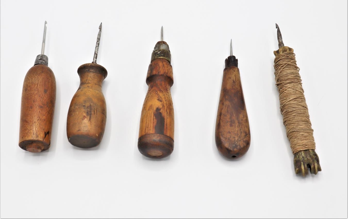 Nálar með handföngum úr tré og eitt úr beini. Notaðar í skósmíði. Handfangið úr beini er vafið með grönnu bandi / þræði.