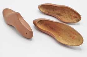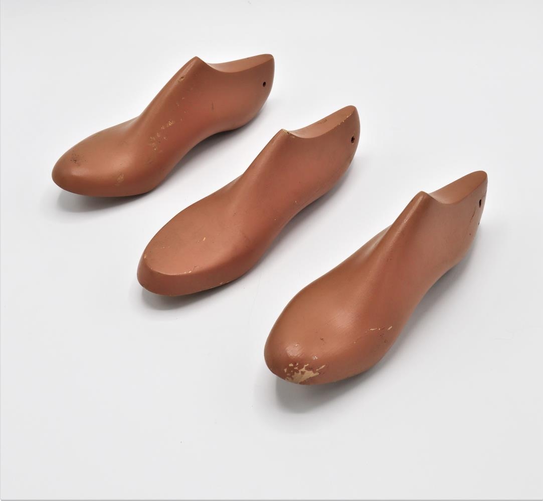 3 stykki skómót úr tré, máluð ljósbrún. Eitt þeirra er áberandi kantaðra en hin. Áletrun undir/inni í þeim. Notuð í skósmíði. Gat er í gegnum hæl á þeim öllum.