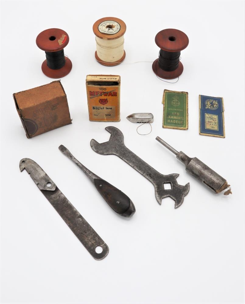 Ýmis verkfæri sem eru í lítilli, stakri skúffu úr tré, sem fylgdi munun frá Arnóri Guðna.