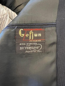 Fermingarföt, jakkaföt. Dökk blá úr ullarefni. Voru keypt árið 1967 fyrir fermingu elsta bróðursins í fjölskyldunni, Jóhannesar - og voru notuð af öllum bræðrunum.