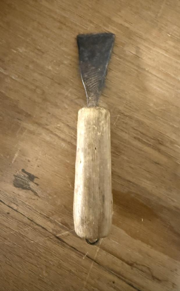 Pottaskafi, tréskeftur. Lengd skafts 8 cm, blaðs 6,3 cm, 2,6 fyrir egg. Blaðið smíðað úr þjöl. Er með vírlykkju á skaftenda. Gefendur: Guðni S. Sigurðsson bóndi á Maríubakka og fjölskylda hans.