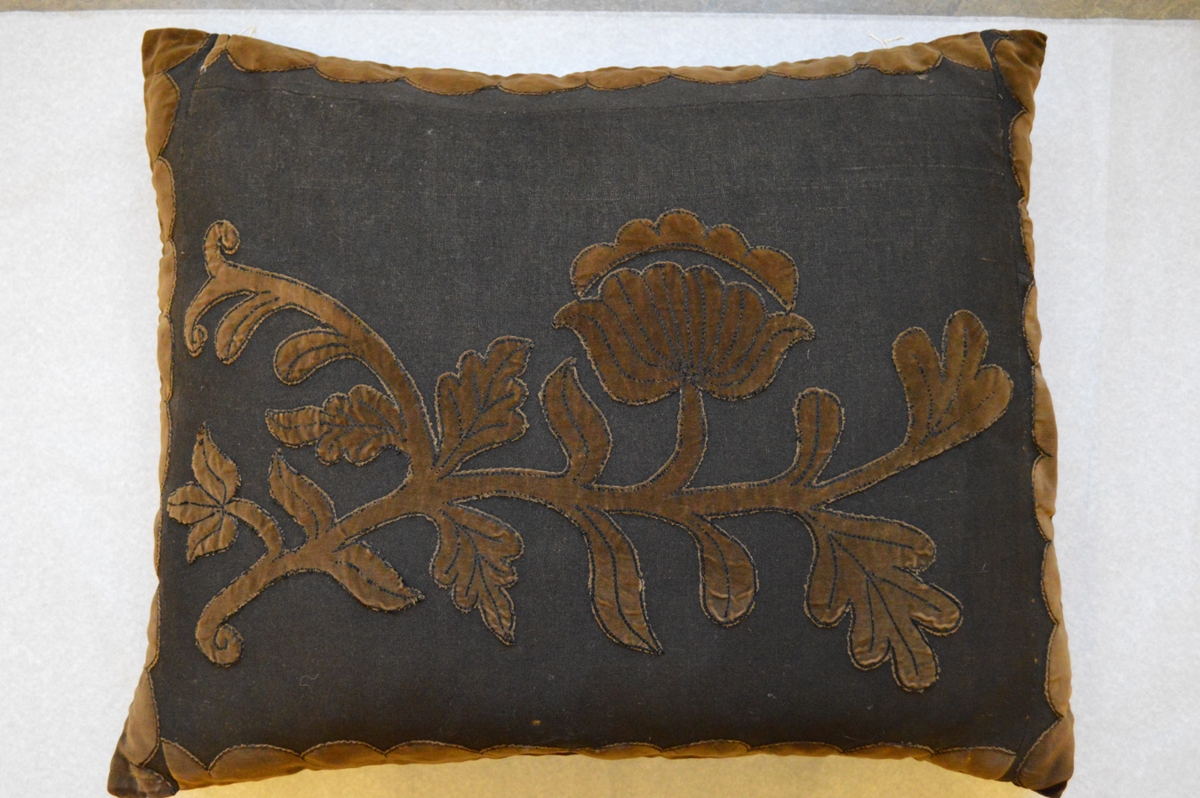 Sófapúði. Efra borð úr faldi á skautbúningi Halldóru Halldórsdóttur í Saurbæ.