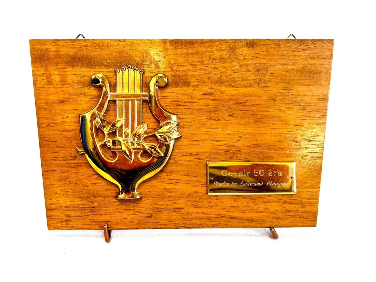 Viðarplatti með gylltri hörpu og áletrun á litlu skilti : Geysir 50 ára. Kveðja frá Lúðrasveit Akureyrar.