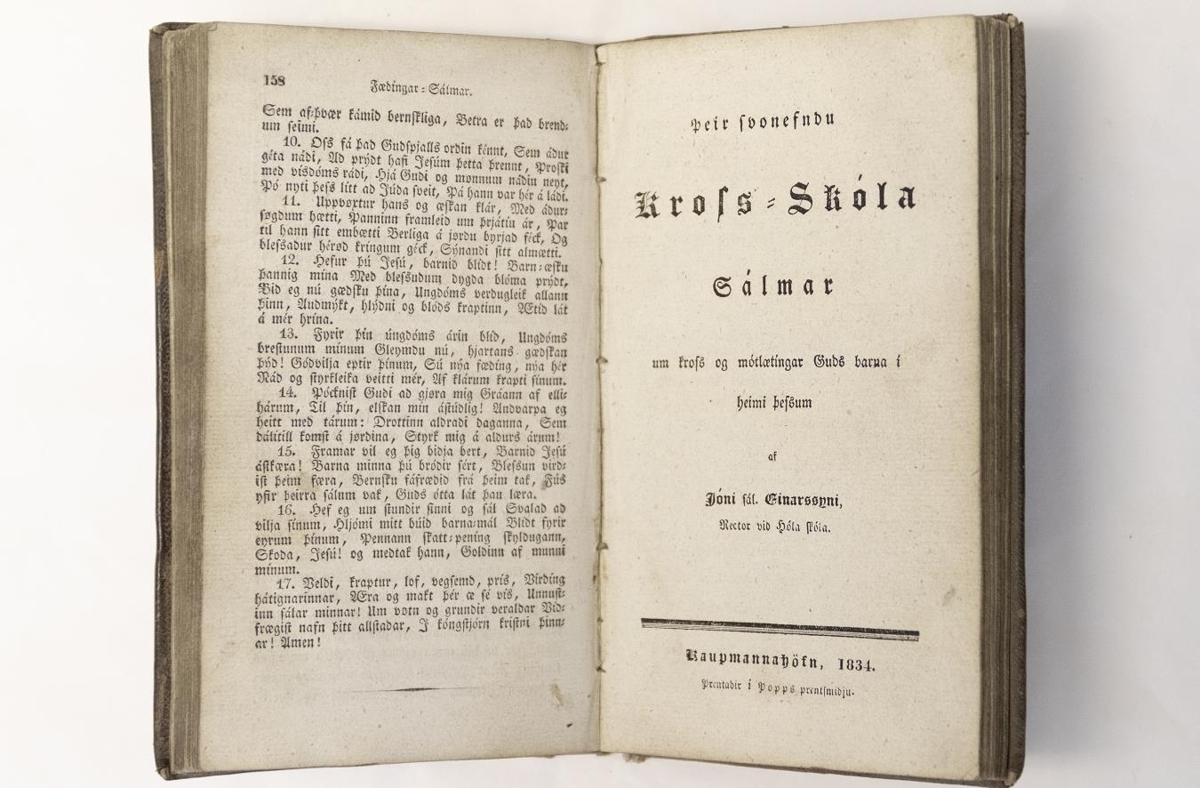 Sálmasafn innihaldandi Sigurljóð, Fædingar-, Krossskóla- og Hugvekju-Sálma = Sigurljód um upprisu Drottins Vors Jesú Krists frá daudum = Þrjátíu Fædingar Sálmar útaf holdtekju og fædíngu Drottins Vors Jesú Krists = Þeir svonefndu kross-Skóla Sálmar um kross og mótlætíngar Guds barna í heimi þessum = Krossskóla sálmar = Fimmtíu Hugvekju-Sálmar =50 Hugvekju-Sálmar = 30 Fædingar Sálmar útaf holdtekju og fædingu Drottins Vors Jesú Krists = Flokkabók / Kristján Jóhannsson, Gunnlaugur Snorrason, Jón Einarsson, Sigurður Jónsson. - [6], 158, 144 bls