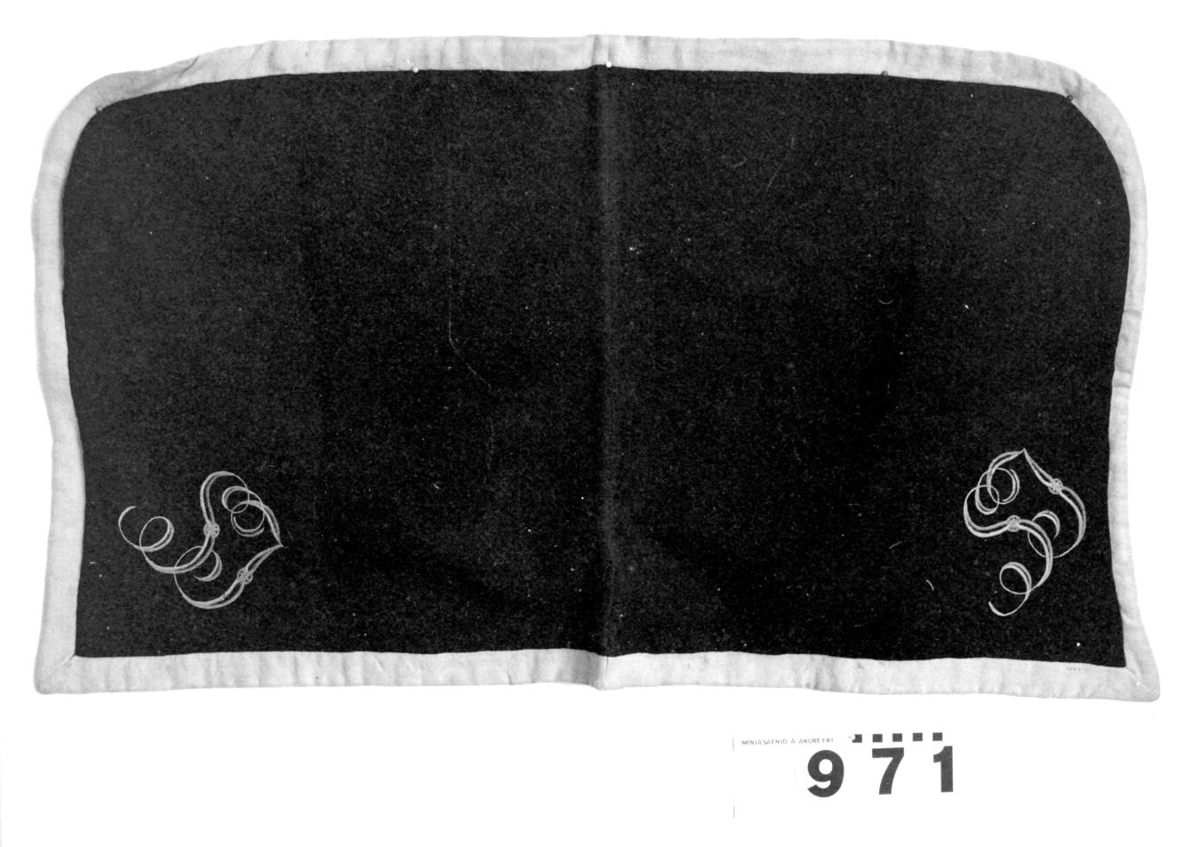 með ljósu efni. Fangamarkið S.J. er saumað út í báðum löfum með tveim
