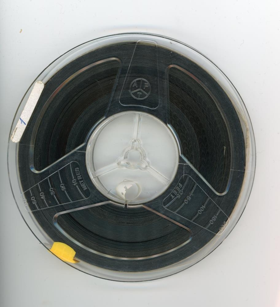Um 200 feta löng kvikmyndafilma, 8mm á breidd, af eldri gerð (ekki Super 8). Filman, sem líklegast er klippt saman úr 5-6 styttri bútum, er undin á gegnsæja spólu úr plasti. Gulur flipi merktur Kodak heldur filmunni svo hún losnar ekki af spólunni.