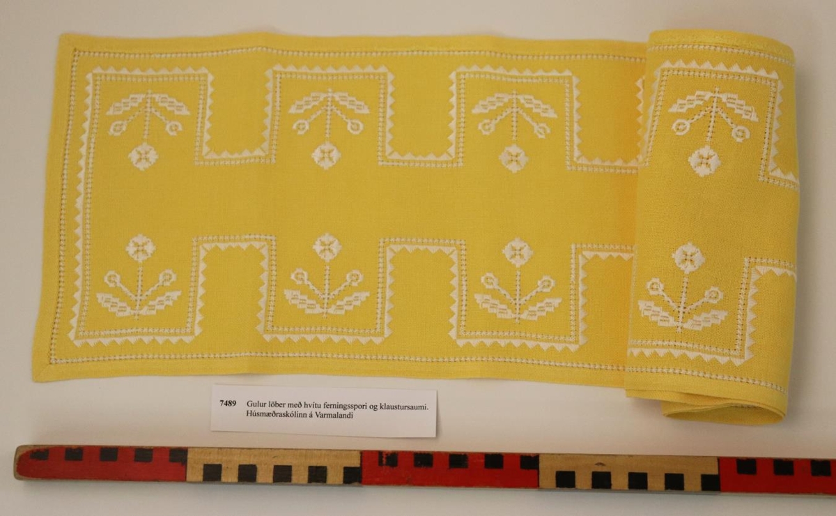 Gulur löber með hvítu ferningsspori og klaustursaumi. Frá Húsmæðraskólanum á Varmalandi.