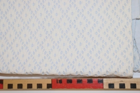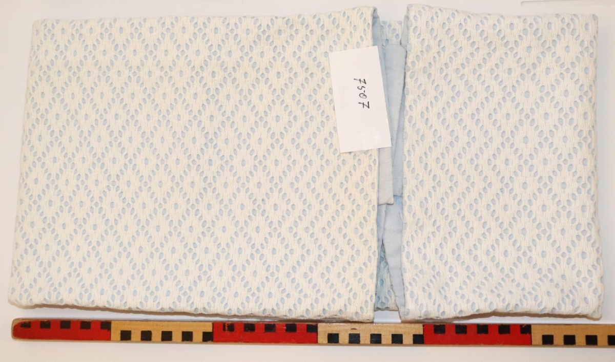 Barnarúmteppi, hvítt og ljósblátt, fínlega ofið úr bómull. Kniplingsvefur. Unnið af nemanda skólans 1961-1962, Elínu Magnúsdóttur frá Birkihlíð í Reykholtsdal.