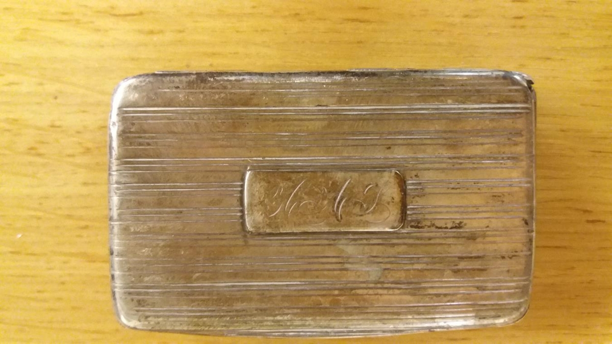 Tóbaksdósir úr silfri, rifflaðar til skrauts. Í ferhyrndan reit á loki er letrað H.A.S. 7 x 4,5 cm.