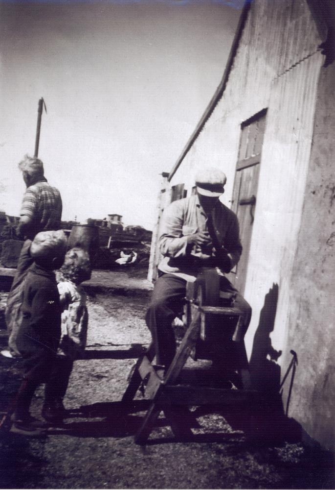 Myndin er tekin við Lónshús í Garði um árið 1948. Páll Sigurðsson frá Akurhúsum í Garði situr við hverfissteininn og leggur ljáinn á. Bóndinn í Lónshúsum, Kristinn Eyjólfsson heldur á orfinu og börnin hans, Sigurjón og Sólveig standa hjá og fylgjast með. Í fjarska má sjá gömlu Lambastaði.