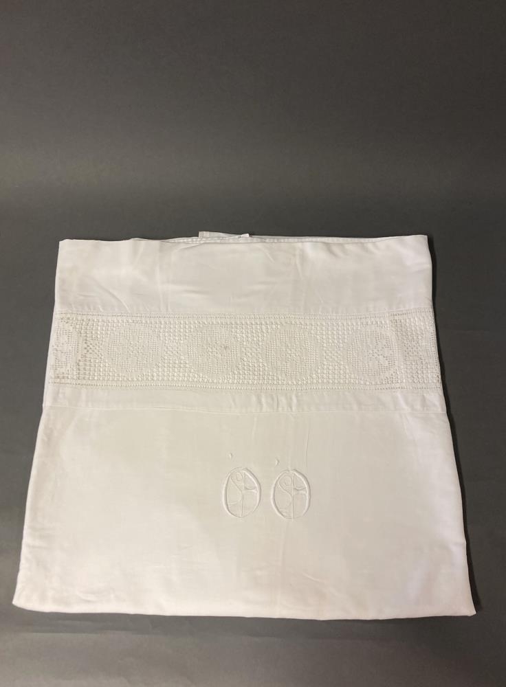 Hvít rekkjuvoð úr líni, með hekluðum bekk og fangamarkinu Ó.Ó. Úr dánarbúi Svövu Fells, ekkju Grétars Ó. Fells.